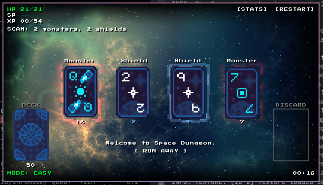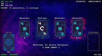A standard deck of 54 playing cards (including jokers) is the dungeon. You draw 4 cards to form a room and must survive by carefully using potions, shields, and combat choices. The original mechanics are preserved, with a new cosmic setting and planned cosmic horror vibes 🐙